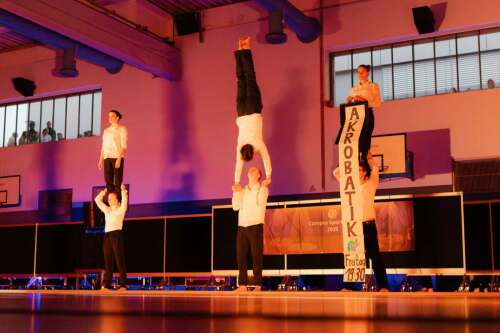 In acrobatics, you can discover the world from completely new perspectives. Here you can learn things that at first seem to be impossible. A special attraction of the sport is that even beginners will usually make progress very quickly. Already after the first lesson you will master the basic figures of chair, flag and flyer on your feet, which will be developed in the following lessons. Most of the exercises are performed in pairs and are secured by another person. It is important that the course participants get to know each other and that you work together with different people. Courage, coordination skills and confidence in yourself and others are the best prerequisites for acrobatics. This course is for beginners as well as for advanced gymnasts. Previous experience in gymnastics is helpful, but not necessary at all. Clothing should be comfortable, allow the body complete freedom of movement, and fit tightly enough to cover what needs to be covered, even for overhead figures. Sneakers are not required, the exercises are performed barefoot (or with socks).